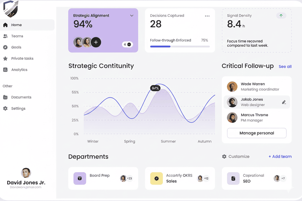 "The Eston has completely transformed my Mondays. Instead of digging through meeting notes to find out who agreed to what, I have a clear dashboard of decisions and ownership. It has effectively eliminated the 'I thought you were doing that' conversations from our leadership team."